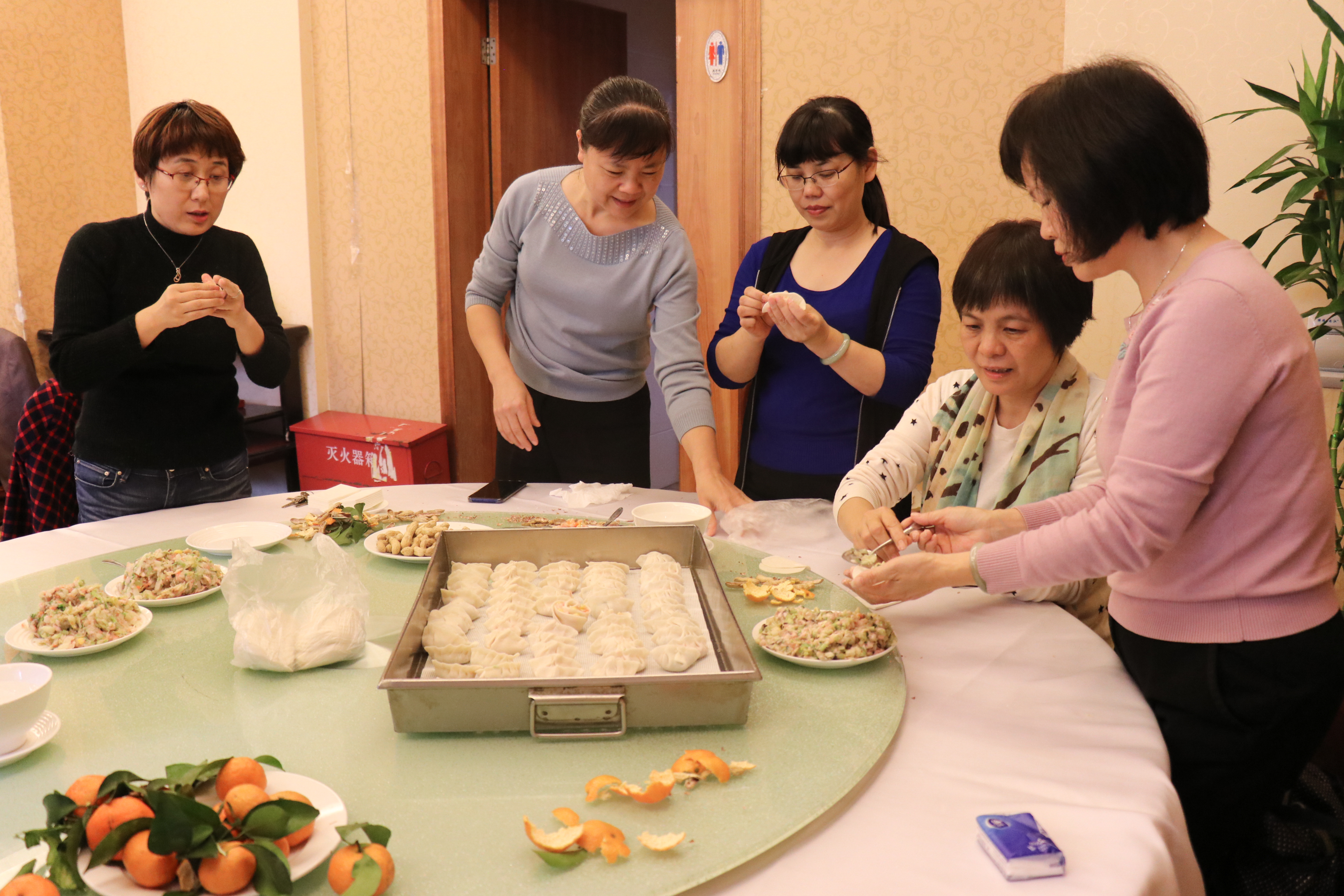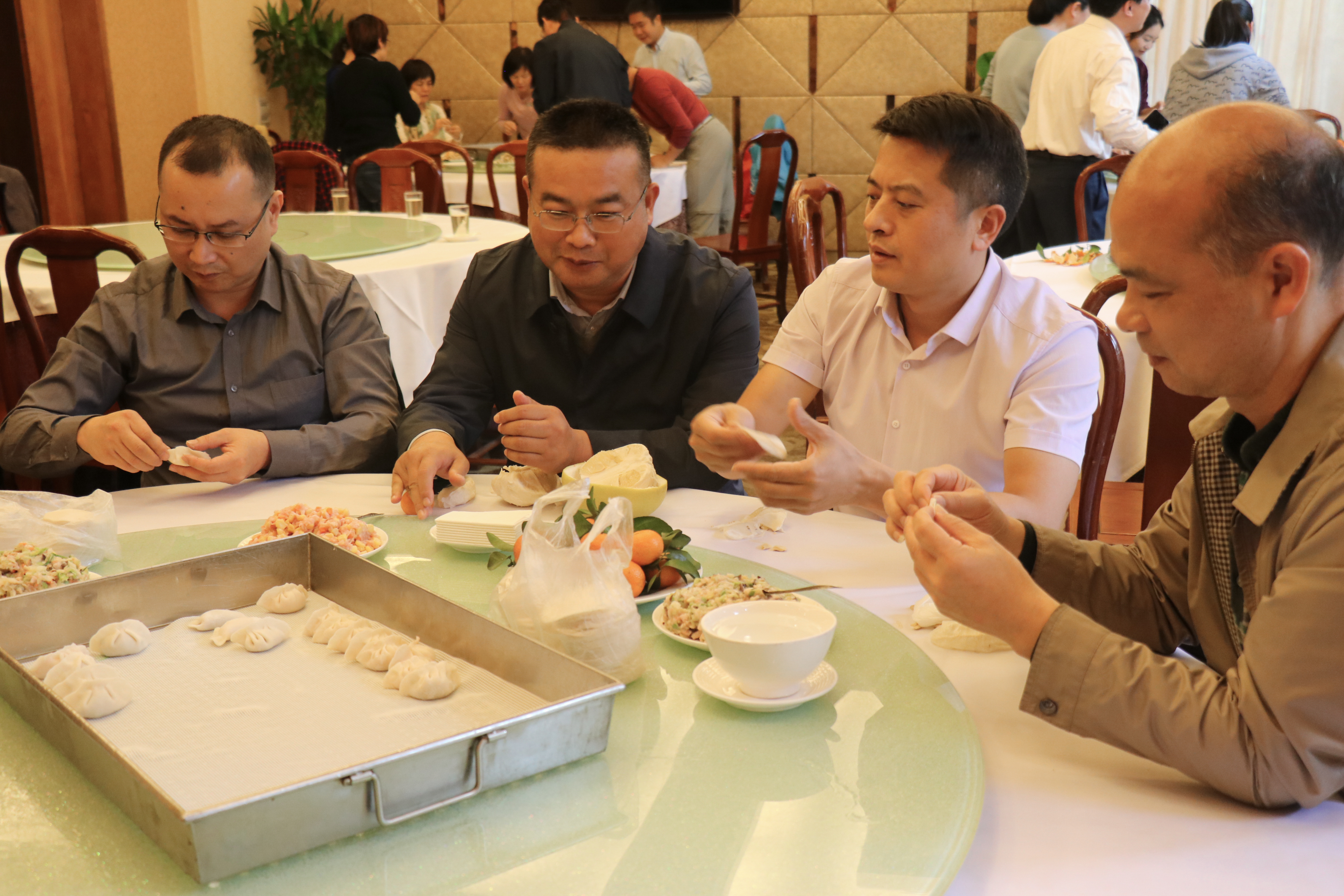后勤部门工会精心准备了活动材料,同志们分工协作,收拾桌子、洗菜、剁馅,欢声笑语间桌上已经放好了饺子皮和饺子馅儿,几个年轻“女将”围坐在桌前各显神通,一双双灵巧的手把馅儿放在饺子皮上,沾点清水轻轻涂抹在四周,再将饺子皮一翻,一挤、一捏折出许多褶子,一只只形状各异、独具匠心的饺子快速出现在盘子里。大家一起吃饺子,品汤圆,共同分享生活、工作的乐趣,也一致希望以后每年举办类似的活动,迎接新年。