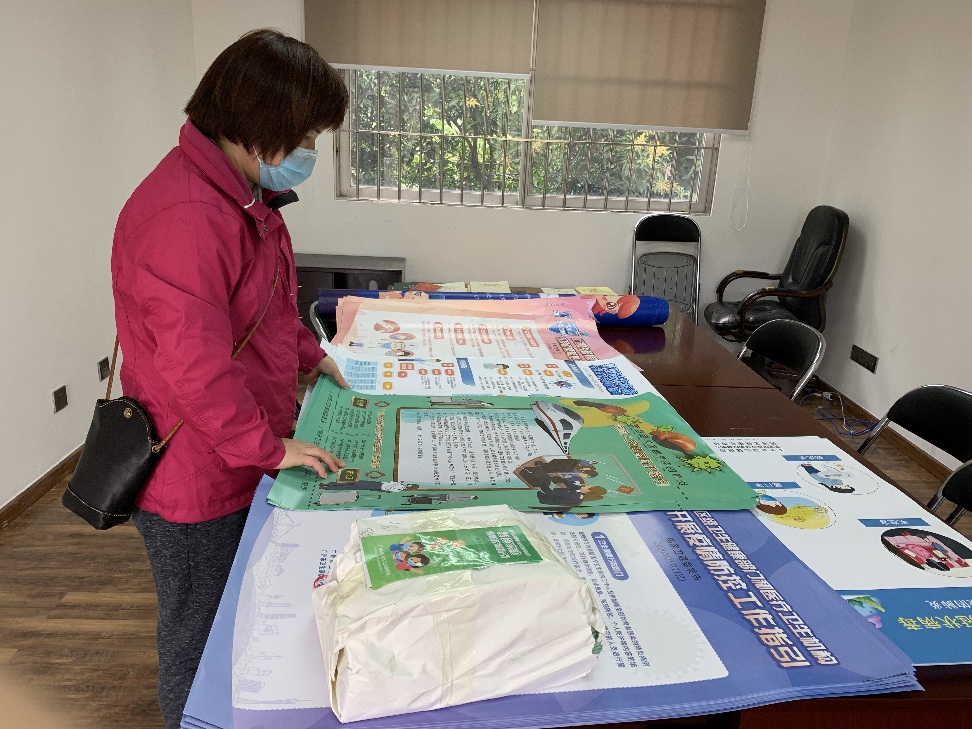 ▲爱卫办李芬老师正在整理发放防疫宣传资料