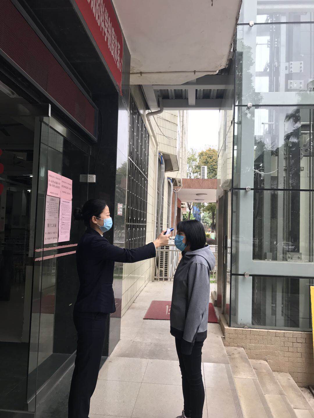 ▲饮服中心对进入食堂就餐人员要求戴口罩并进行体温测量