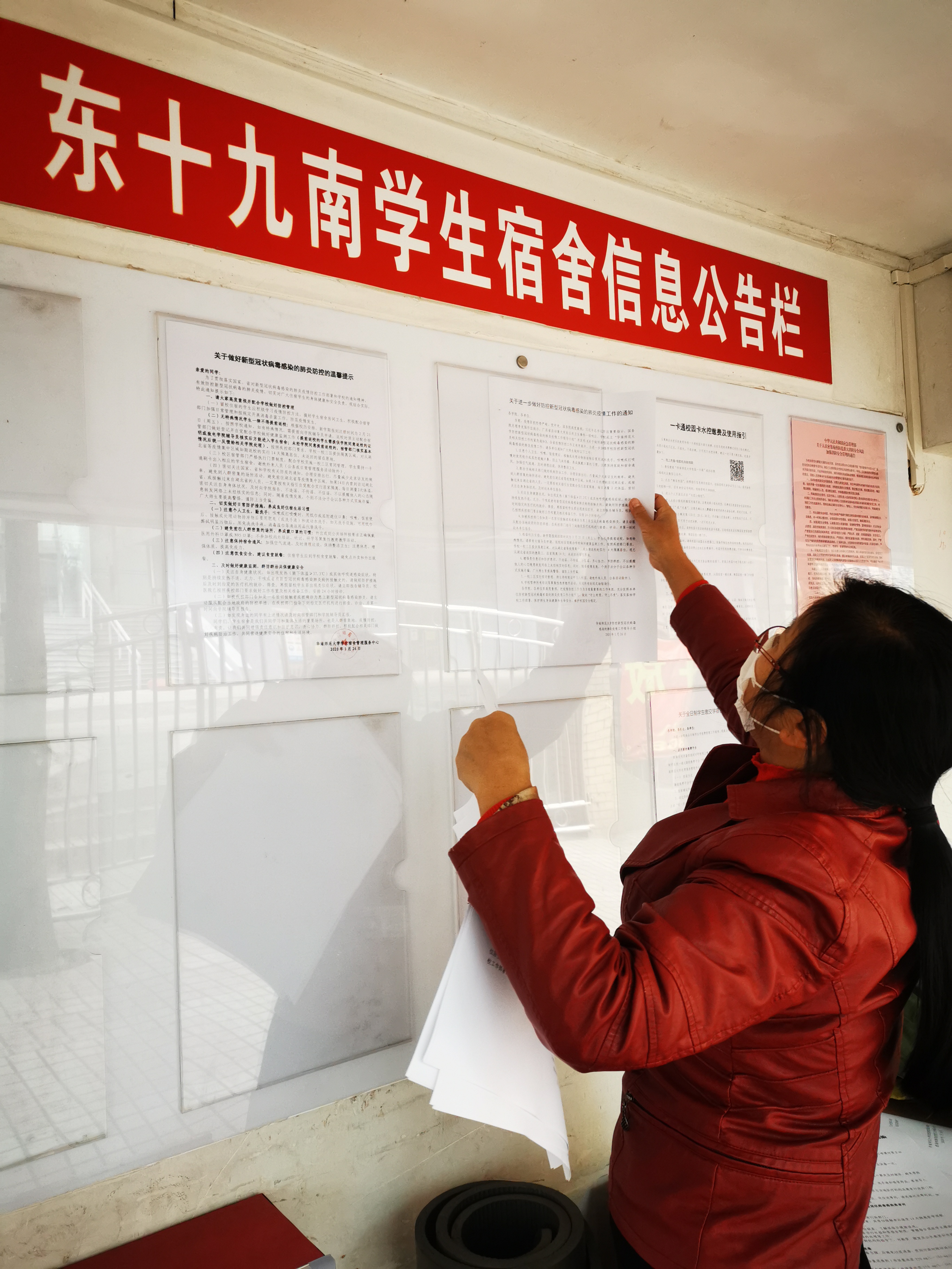 ▲宿管中心党支部张爱武同志正在进行疫情知识的宣传材料张贴