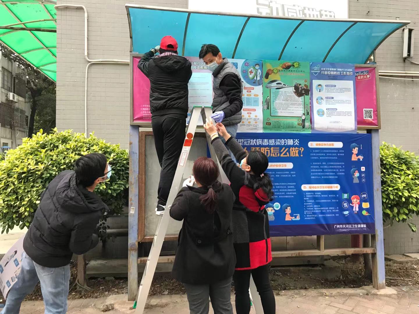 ▲宿管中心党员带头在各宣传栏张贴防疫宣传资料