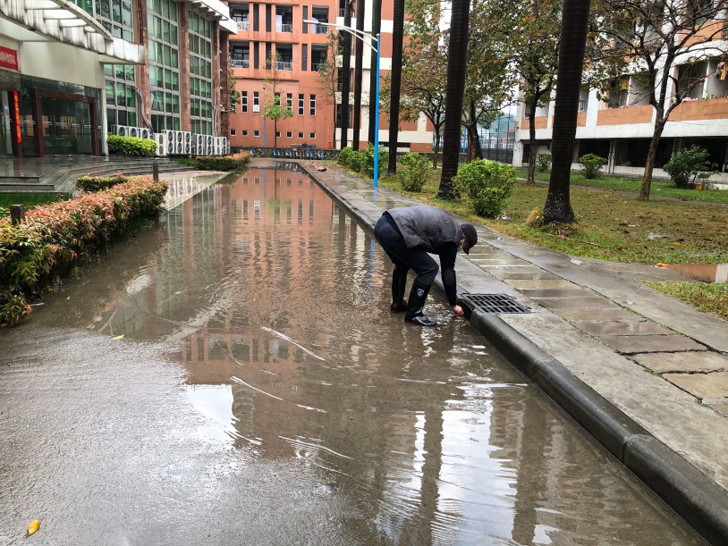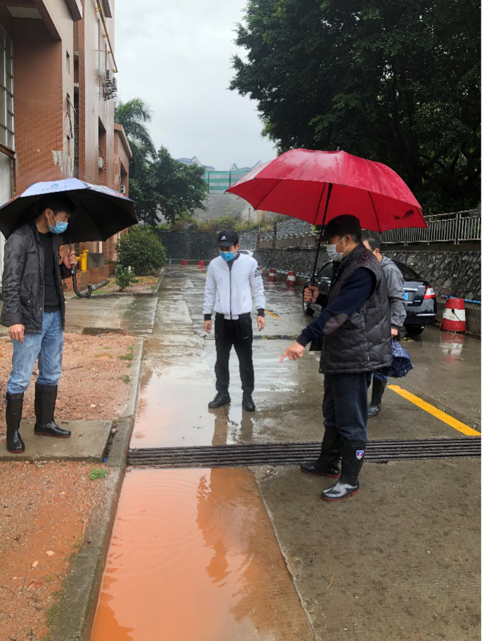 除了了解各部门各处的防控工作外,何景陶及相关负责人还到校园主干道等地方检查了暴雨后的积水情况。暴雨后的积水问题一度是校园大患,在如今的特殊形势下,倘若不加以重视,积水带来的污染及蚊虫病害将不利于疫情防控工作开展。所幸去年学校开展了雨污分流工程,于校园主干道铺设新建污水管道、建筑单体周边改造分流管道,实行雨污分流,在校内污水排放达标的同时,解决校园局部暴雨积水问题,此时已发挥作用,学校积水问题有了一定改善,总体排水顺畅,只有少量积水点存在,基建处相关负责人已对其进行标记,将在疫情平缓开学后对积水点进行统一改进。
