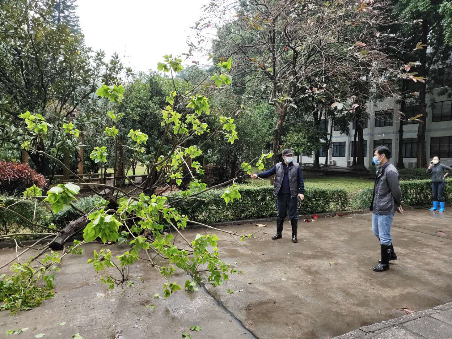暴风雨肆虐后的校园,部分树木枝干被刮倒,出现不少残枝落叶,在石牌校区检查过程中,何景陶要求立即对其进行处理,保持校园整洁,保障留校师生安全,为疫情防控工作提供便利。