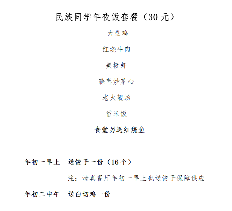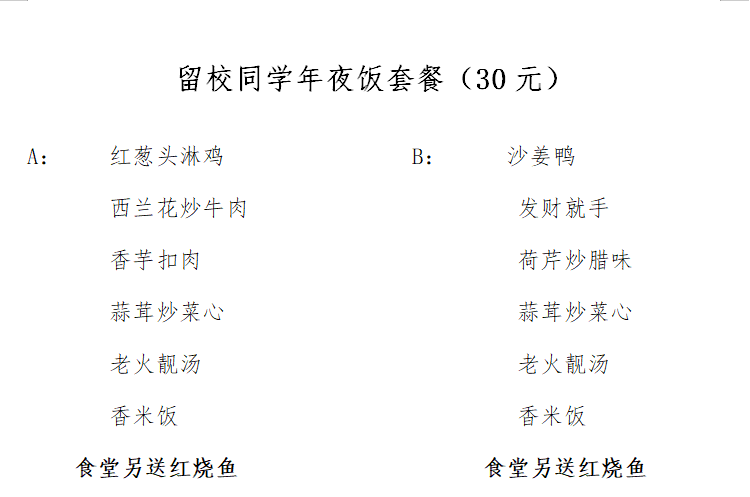1.2月11日(大年三十)晚餐,学生工作部、研究生工作部与后勤管理处共同为留校同学免费送“年夜饭”,后勤处再为留校同学加送“鱼跃龙门”一份(红烧鱼一份);