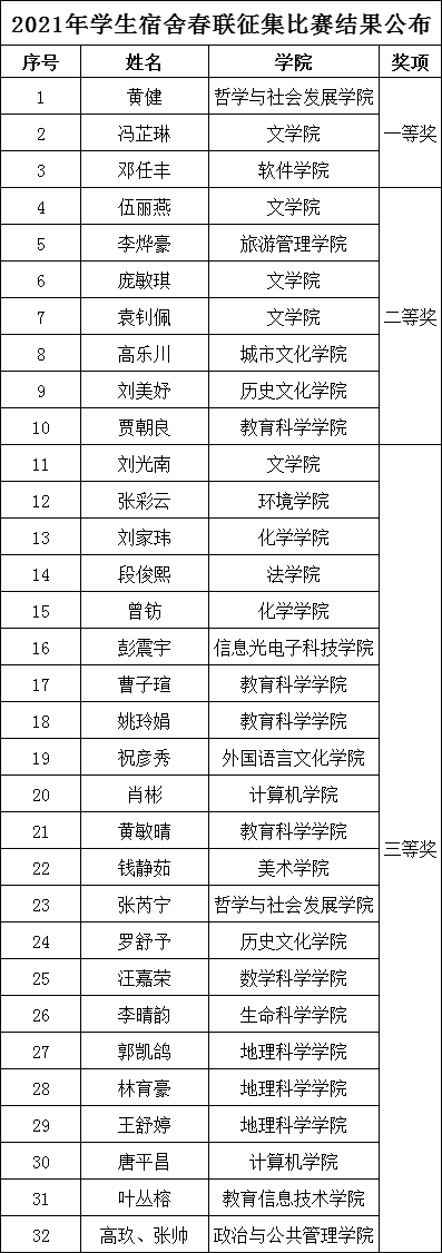 为弘扬民族优秀传统文化展现华师的文化底蕴和华师学子的精神风貌营造新春祥和、喜庆的节日氛围表达新的一年接续奋进的美好愿望,2021年1月,学生宿舍管理服务中心主办了2021年“学生宿舍春联征集比赛”,现将比赛获奖结果公布如下:
