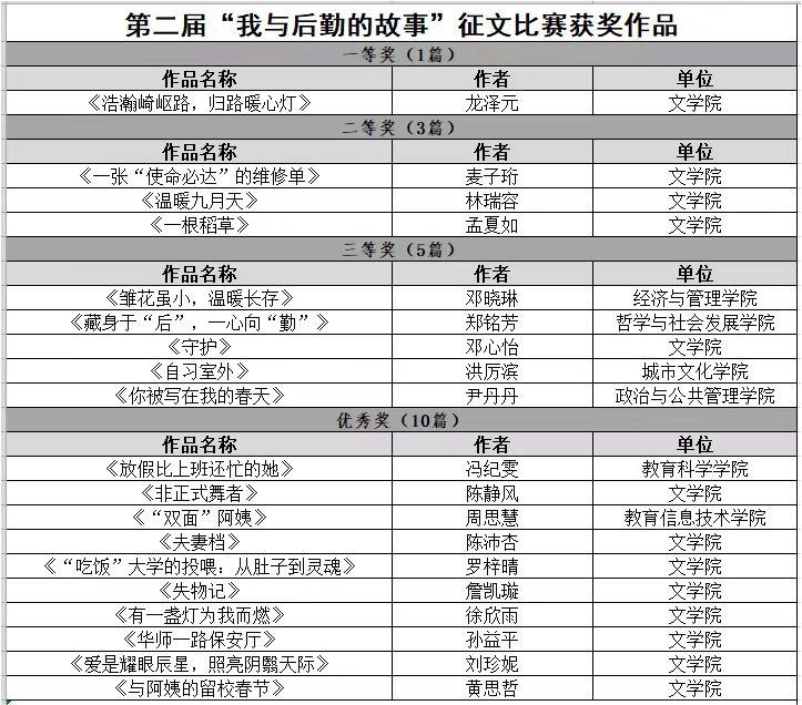 1、此次征文比赛设一等奖1名,二等奖3名,三等奖5名,优秀奖若干,并为获奖者颁发奖金、奖品及相应获奖证书;届时,获奖作品将会在华南师范大学后勤管理处官网、“华师后勤”微信公众号发布。欢迎广大师生踊跃投稿。