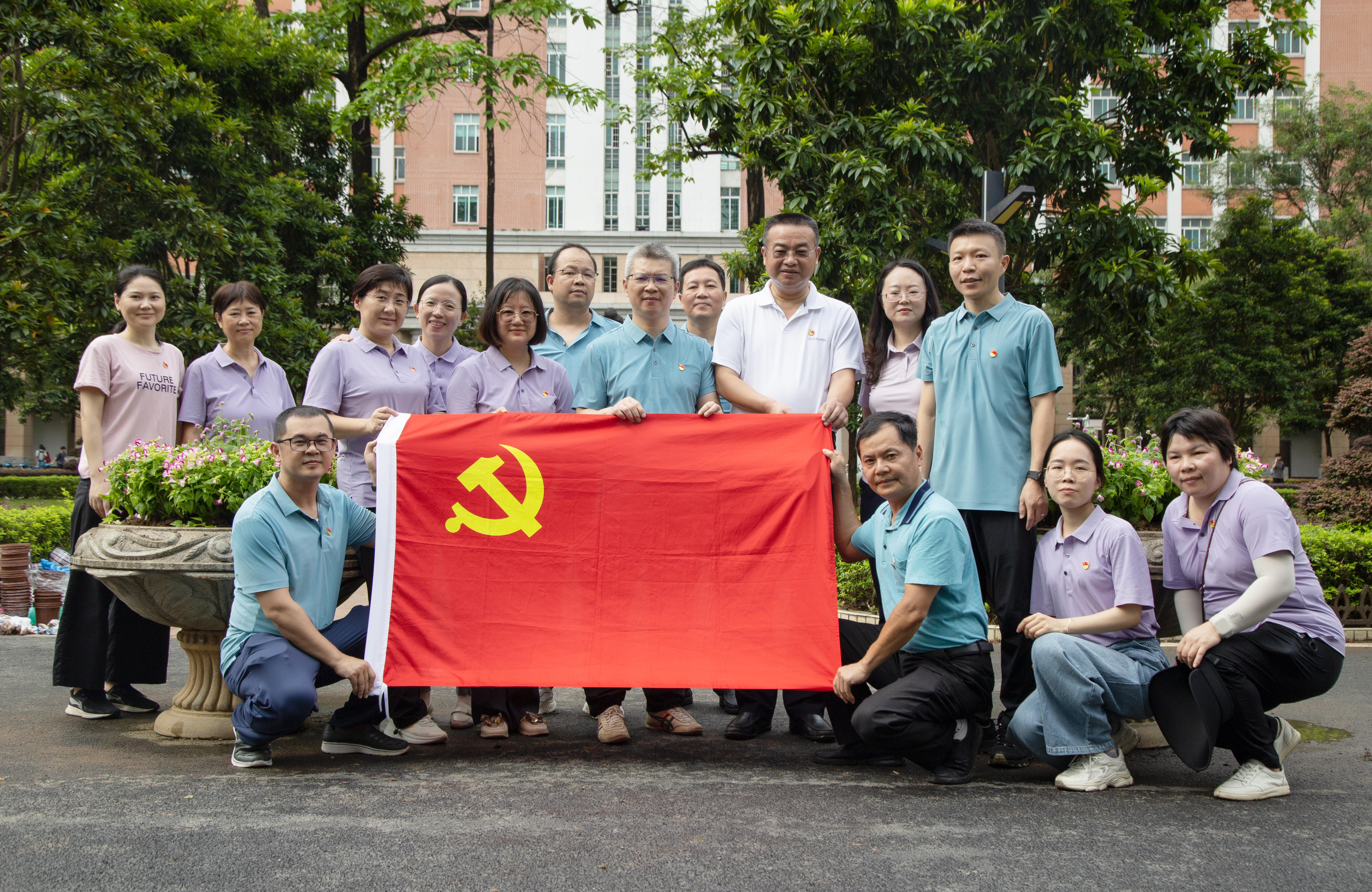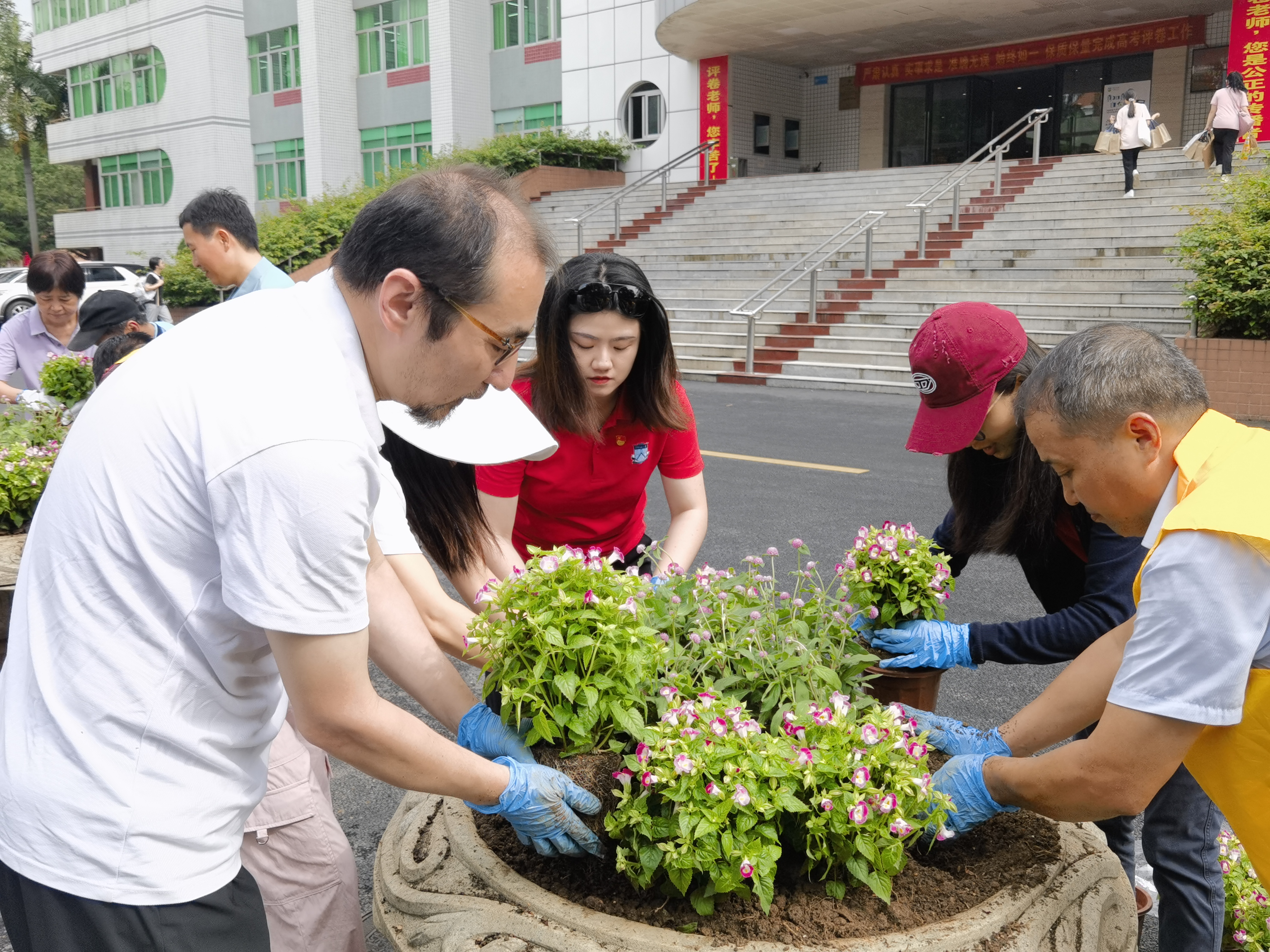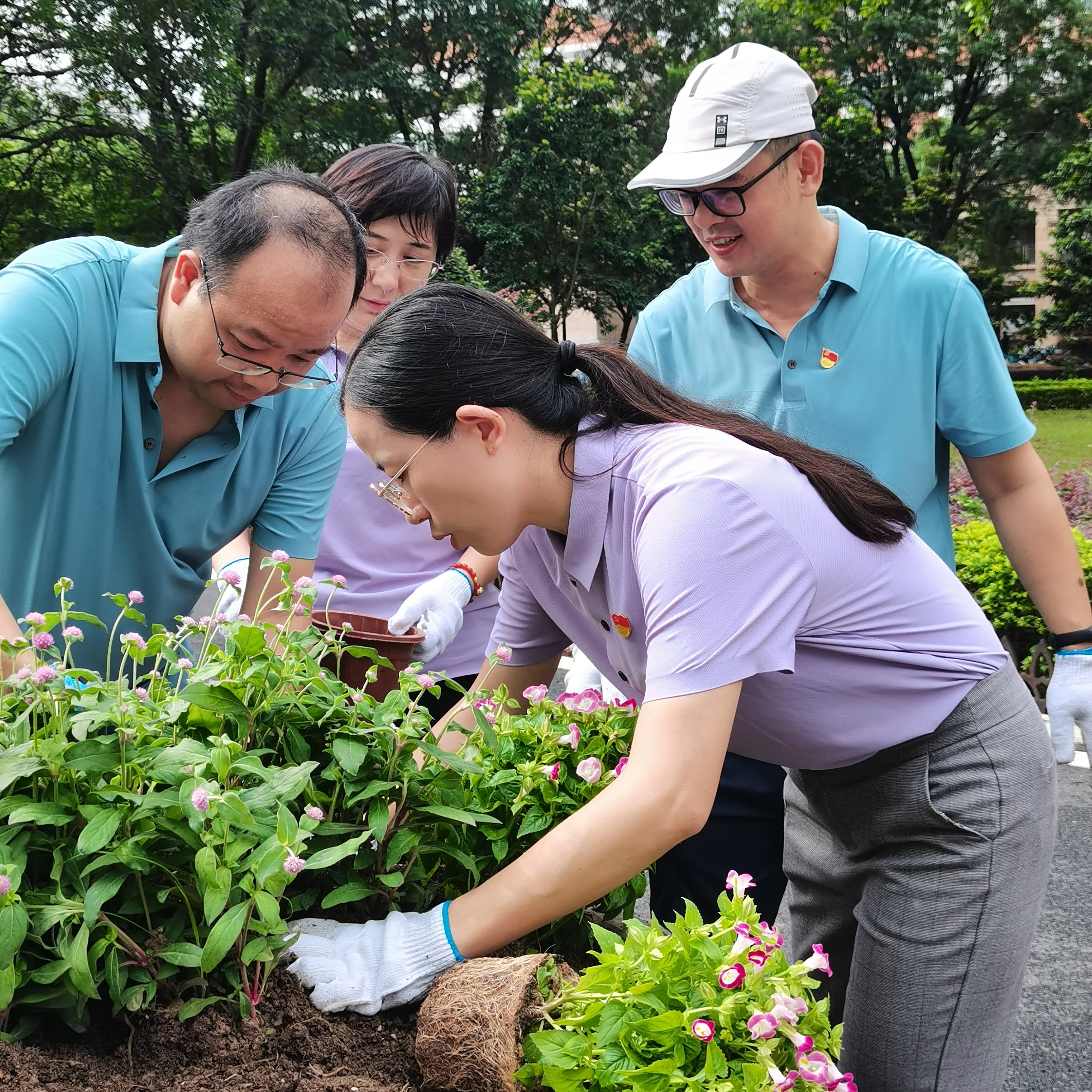 在广东雨水连绵数月以来难得一见的晴空下,党员同志们兴致勃勃地围着花坛,认真学习种植技巧,分组协作,干劲十足。清理花坛、松土杀菌、按“品”字型由内往外种植新花、浇水淋透……伴着绚丽的花朵、芳香的泥土和校园清脆的鸟啼,党员同志们愉快地交流、尽情体验亲手栽花的乐趣,种植活动有条不紊地进行着。