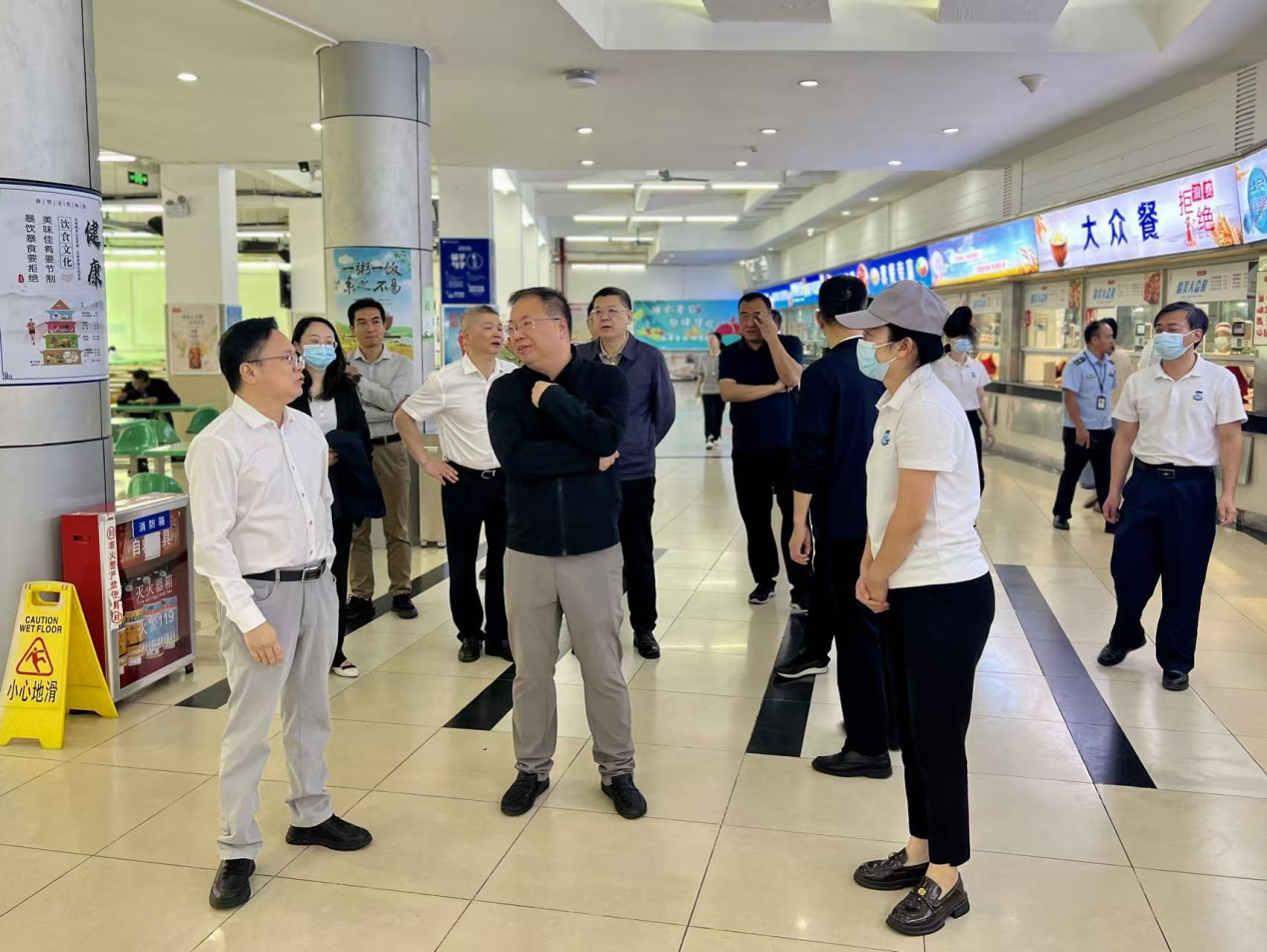 2024年11月9日上午,广州市市场监督管理局党组书记赵军明、副局长苏学标,天河区市场监督局局长肖泽顺、副局长周群及相关部门负责人到我校石牌校园开展食品安全检查调研工作,副校长潘文庆,后勤管理处处长骆立骞等陪同调研检查。