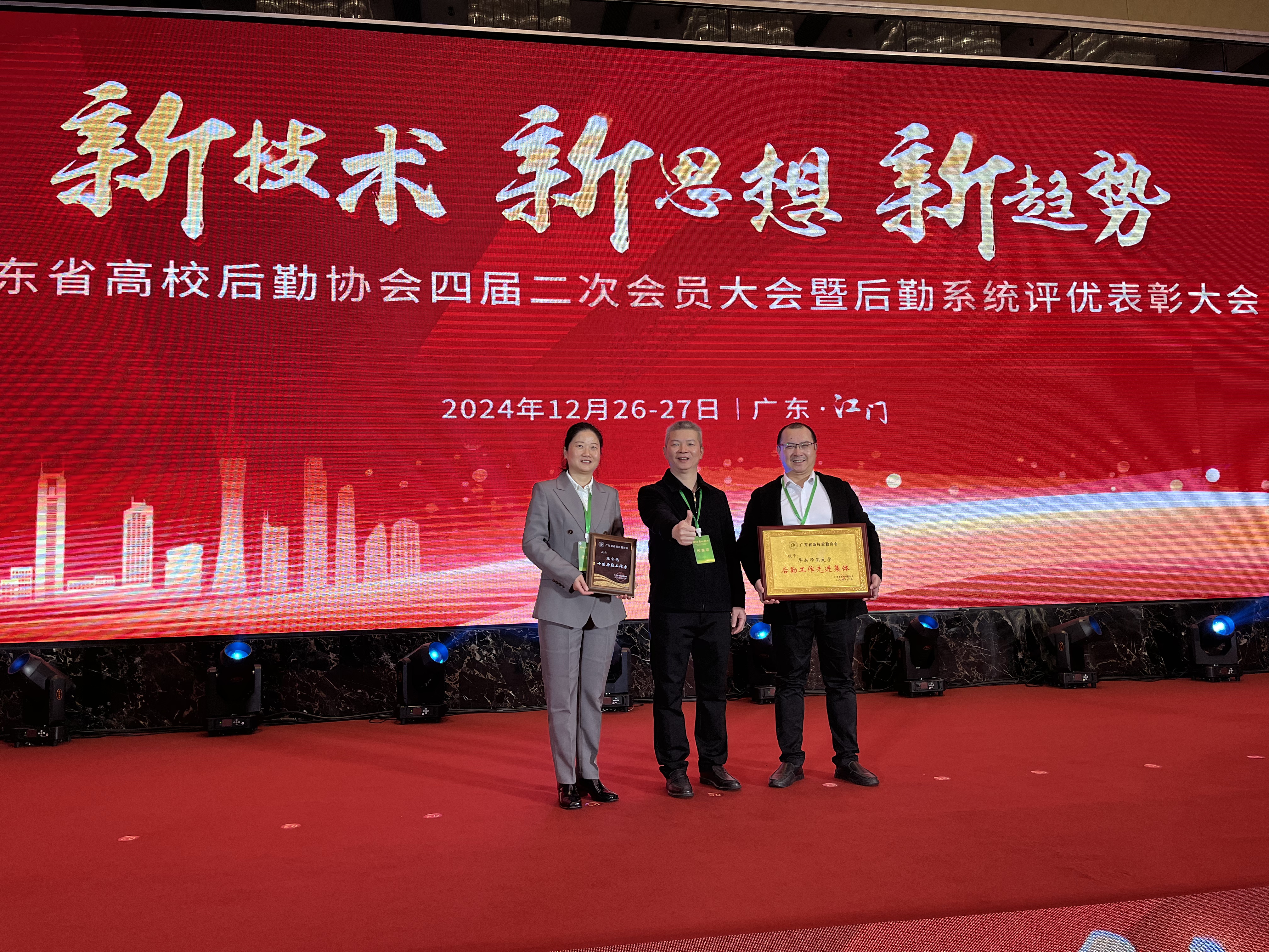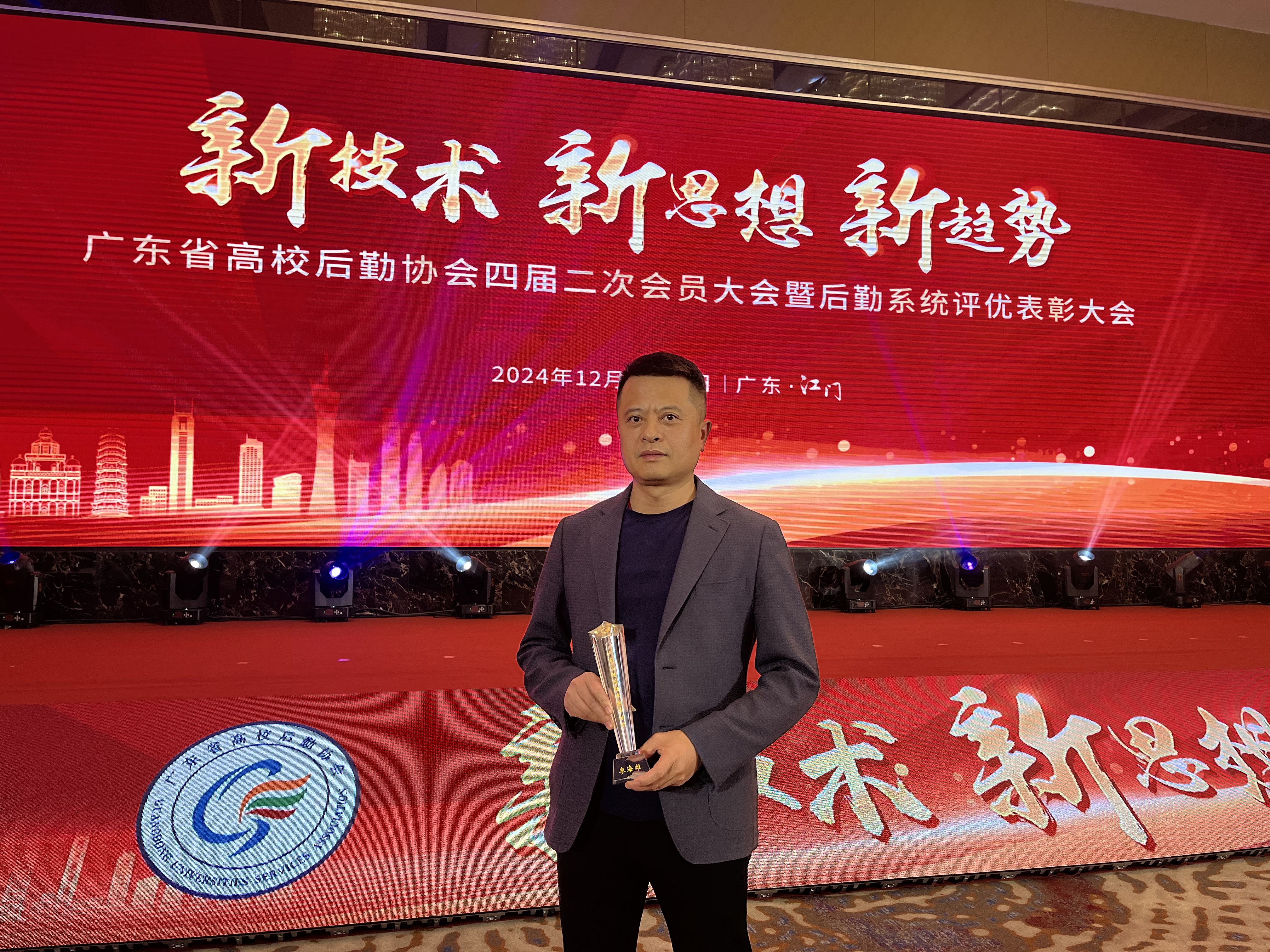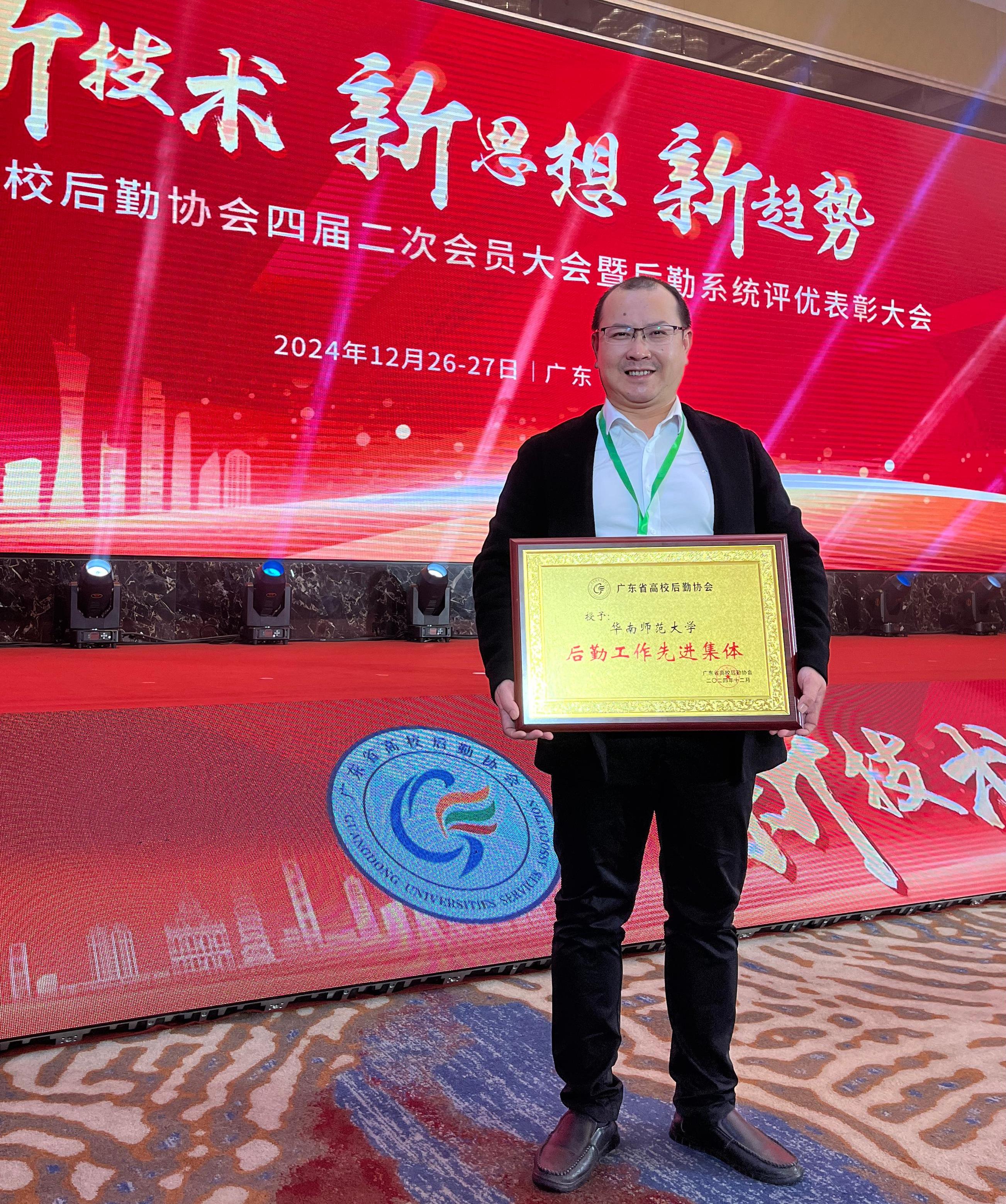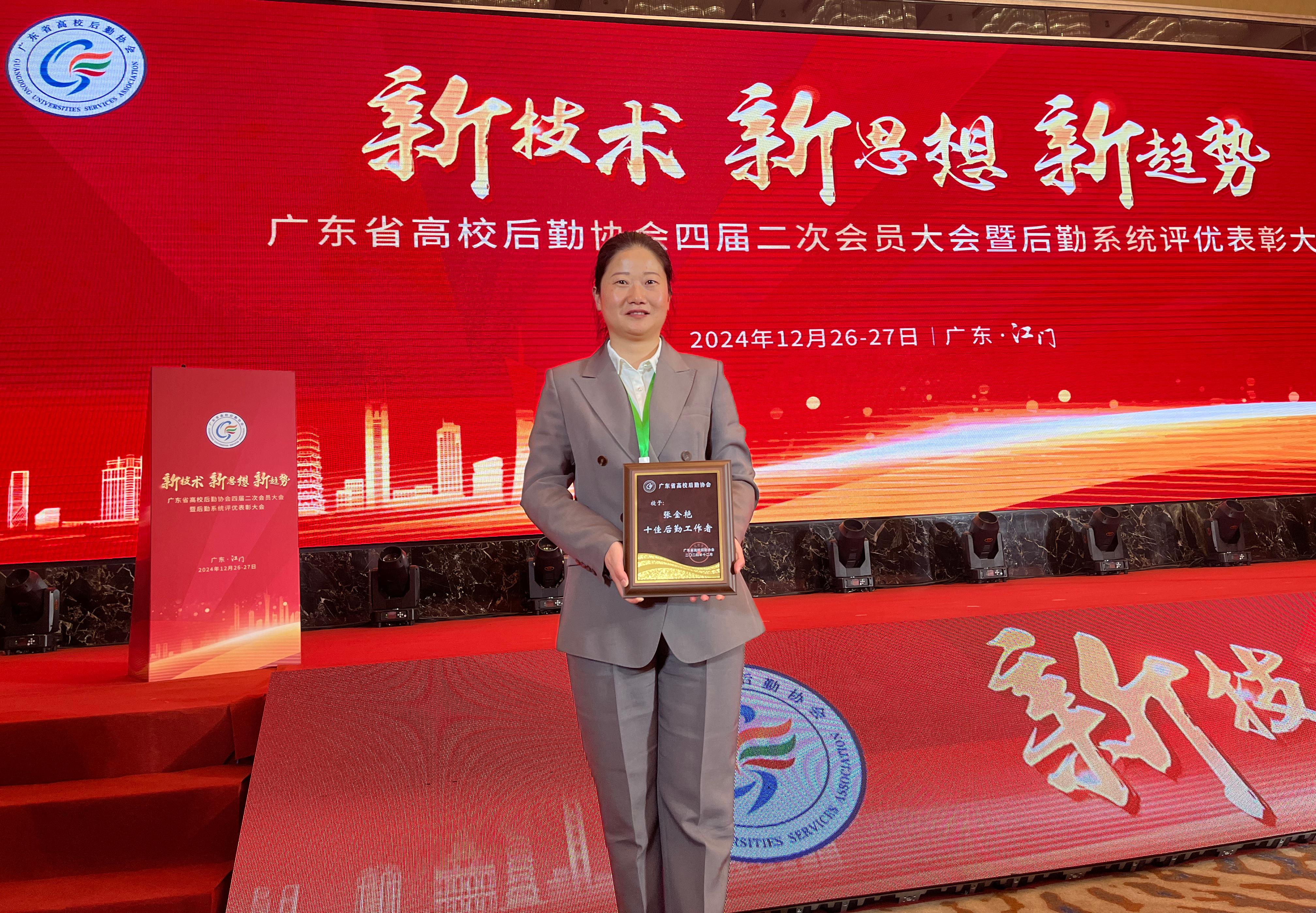 会议对2024年度广东后勤系统评优获奖人员及集体进行了表彰。我校后勤管理处学生宿舍管理服务中心被授予2024年度广东高校后勤系统“后勤工作先进单位”荣誉称号,中心负责人陈国球代表中心接受表彰;饮食服务中心主任廖海雄被授予第二届“广东高校后勤卓越奉献奖”荣誉称号,饮食服务中心副主任张金艳被授予2024年度广东高校后勤系统“十佳后勤工作者”荣誉称号。