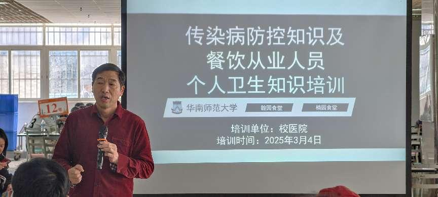 为深入贯彻落实食品安全和校园传染病防控工作的相关要求,切实提升餐饮从业人员的卫生安全意识与专业防控能力,全方位保障广大师生的饮食安全和身体健康。近日,后勤管理处饮食服务中心分校园精心组织开展了《食品安全日常操作规范及传染病防控知识》系列培训。本次培训由校医院的专业医护团队及饮食服务中心主任助理、监管部部长蓝诗亮担任主讲,饮食服务中心支部书记叶育贤、副主任张金艳、陈巧娴及中心全体员工参与此次培训。
