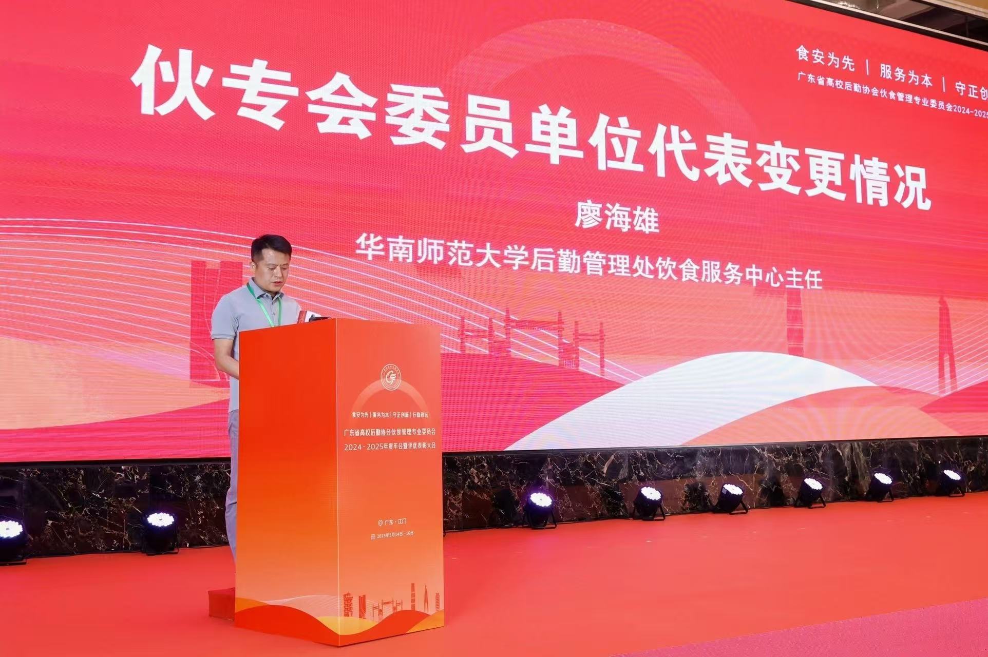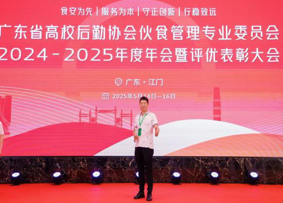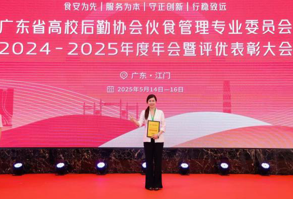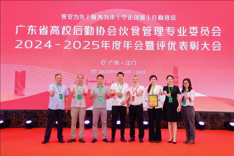 5月14-16日,广东省高校后勤协会伙食管理专业委员会(以下简称“伙专会”)2024-2025年度年会暨评优表彰大会在广东江门召开,后勤管理处处长骆立骞带队参加。食服务中心两位食堂管理者荣获表彰,其中,陶园食堂经理胡素标获评“伙食工作突出贡献奖”,雍园食堂经理黄小花获评“优秀食堂经理”。