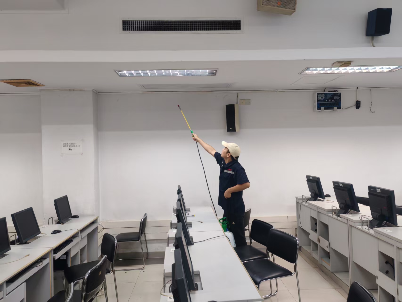 自评卷前一周启动深度清洁,对有关场地区域全面清洗消毒。评卷期间实行“定时+动态”保洁模式,每日清晨提前1小时完成整体清扫,午休及晚餐时段二次清洁,专人巡逻清理突发垃圾,累计投入30人次,实现“零干扰、零污染”,为评卷教师营造整洁舒适的环境。