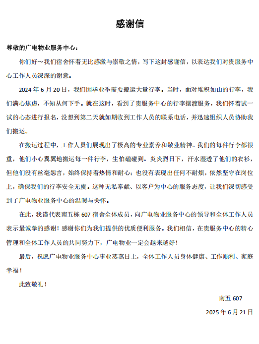6月17日至7月6日,后勤管理处开展“毕业季暖心护航”专项行动,联合大学城校园与石牌校园物业公司打造“行李驿站+爱心专列”双轨服务,为毕业生送上独具温度的“离别礼物”。本次服务累计为千余名毕业生提供免费寄存行李3165件,组织爱心运输112车次,完成物品搬运850余件,以实实在在的行动打通了离校服务的“最后一公里”。