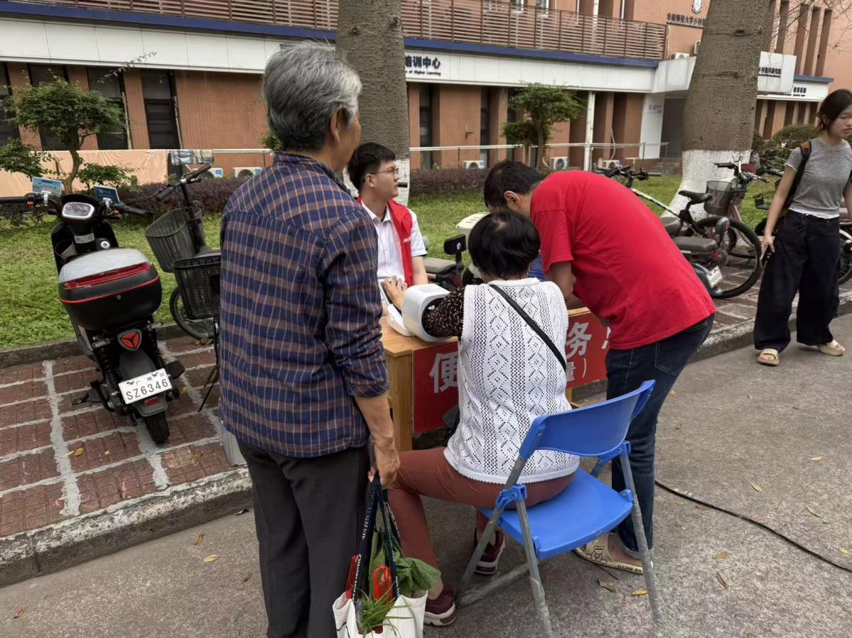 健康关怀类:设置血压测量服务点,医护志愿者耐心为居民测量血压、讲解健康注意事项,用专业守护师生健康。